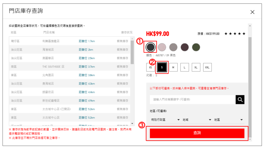 ※直接點選 < 查詢 > 即可查看全線門店的庫存,如需要查看指定門店,亦可輸入店鋪名稱或選擇地區進行查詢。